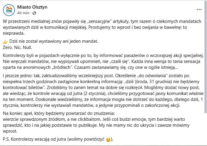 • 09:58 – „Cicha edycja” na profilu miasta: Administratorzy edytują poranny post. Zamiast „do odwołania”, wpisują: „dziś (środa, 31 grudnia) nie będziemy kontrolować biletów”. Edycja przechodzi niezauważona przez większość użytkowników (brak powiadomień na Facebooku).