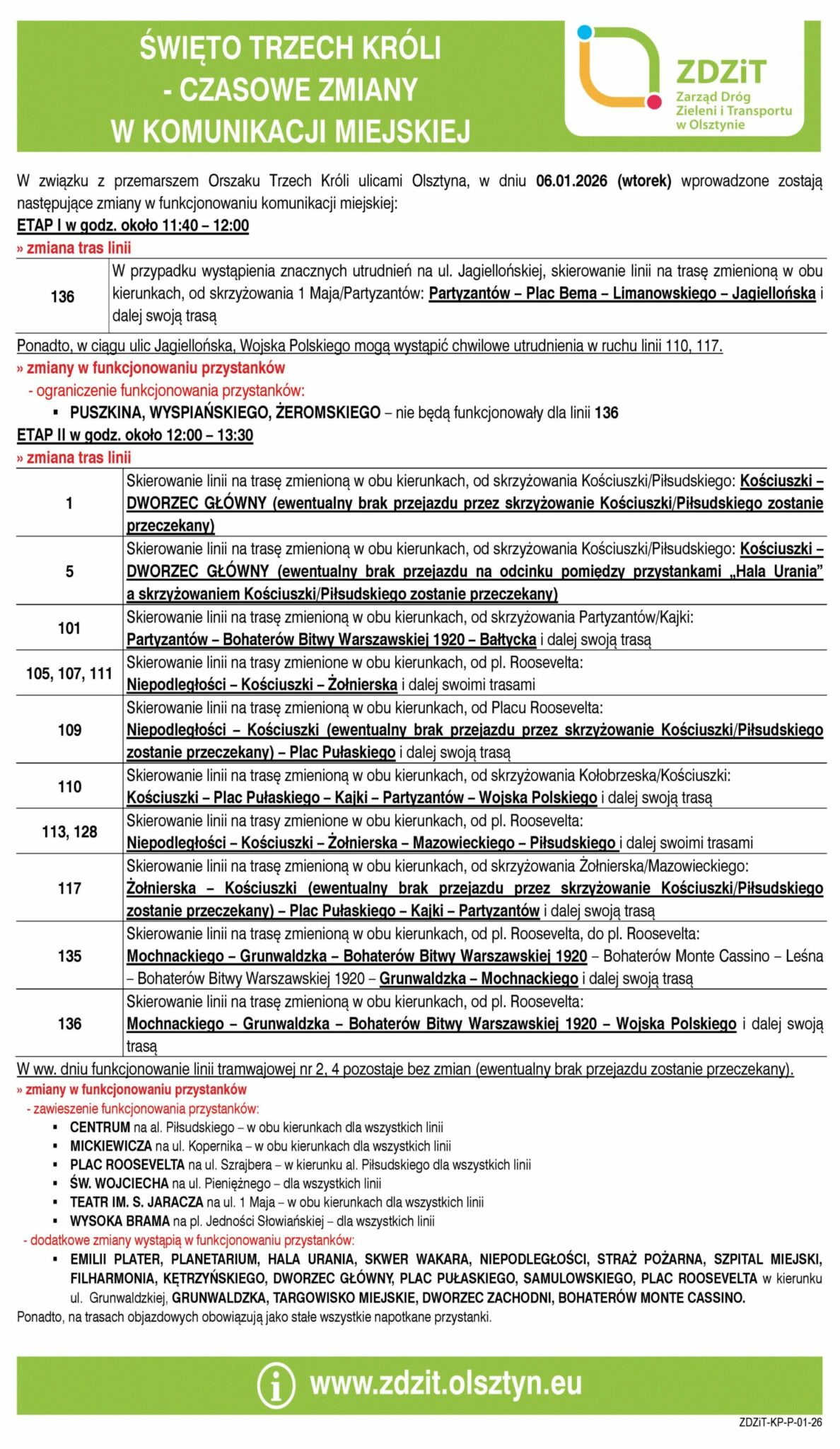 Zarząd Dróg, Zieleni i Transportu w Olsztynie zapowiedział czasowe korekty w kursowaniu autobusów i tramwajów w związku z przemarszem Orszaku Trzech Króli. Modyfikacje obejmą zarówno trasy wybranych linii, jak i funkcjonowanie przystanków w centrum miasta oraz na głównych ciągach komunikacyjnych .