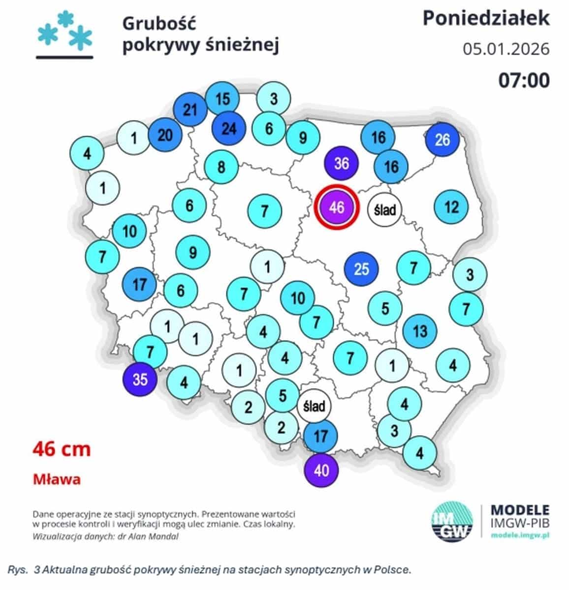 Na Warmii i Mazurach utrzymuje się kilkunastocentymetrowa pokrywa śnieżna, lokalnie przekraczająca 30 cm. Choć w ostatnich godzinach nie notowano intensywnych opadów, śnieg zalegający na gruncie sprzyja silniejszym spadkom temperatur w nocy.
