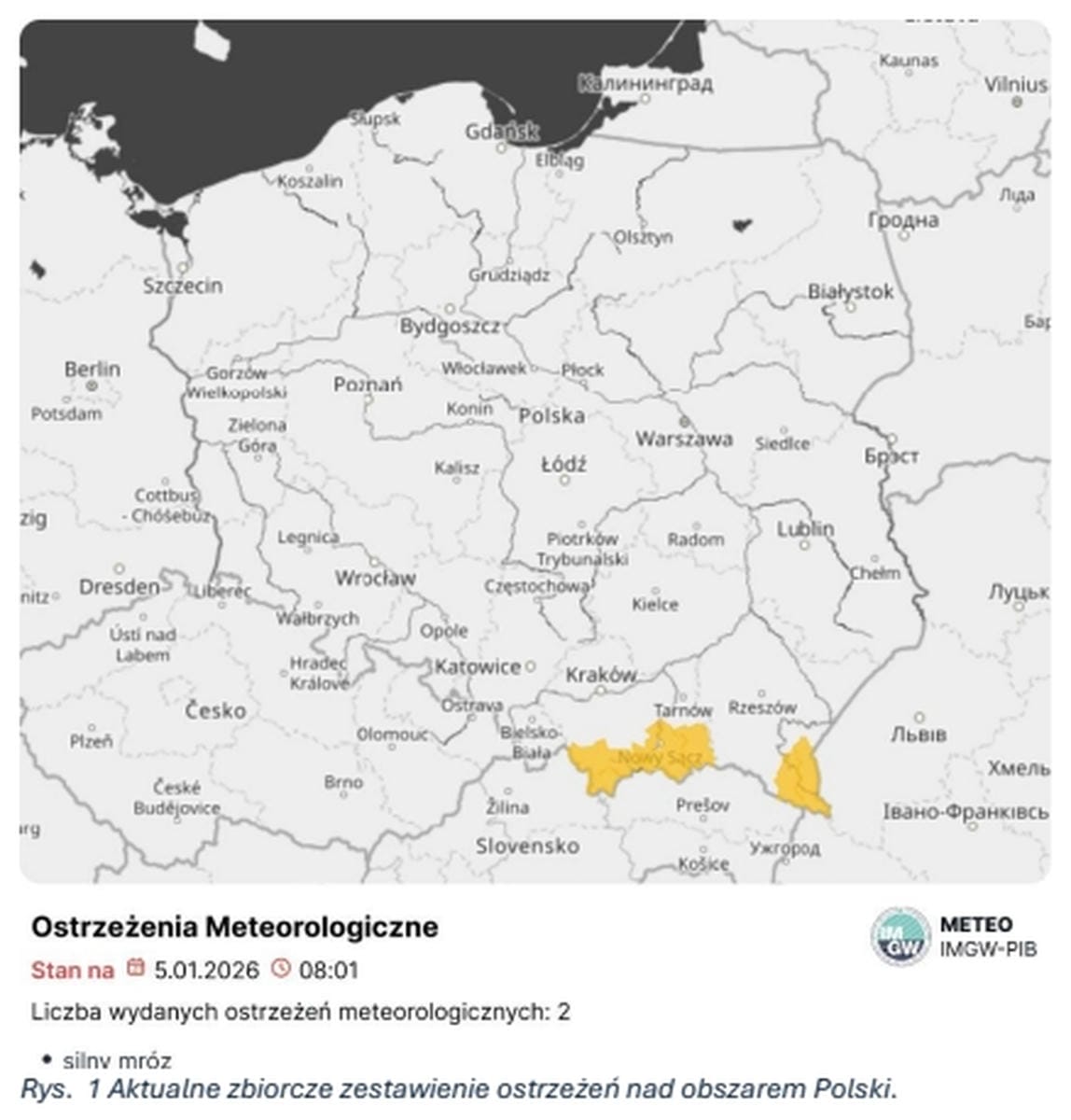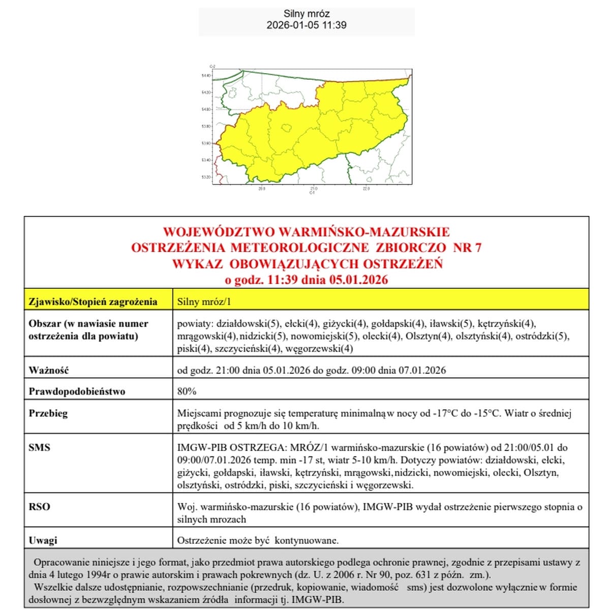 Według porannego komunikatu IMGW-PIB z 5 stycznia 2026 roku, województwo warmińsko-mazurskie początkowo nie było objęte aktywnymi ostrzeżeniami meteorologicznymi. Sytuacja zmieniła się jednak w ciągu dnia. Przed południem IMGW wydał ostrzeżenie pierwszego stopnia przed silnym mrozem dla znacznej części regionu.