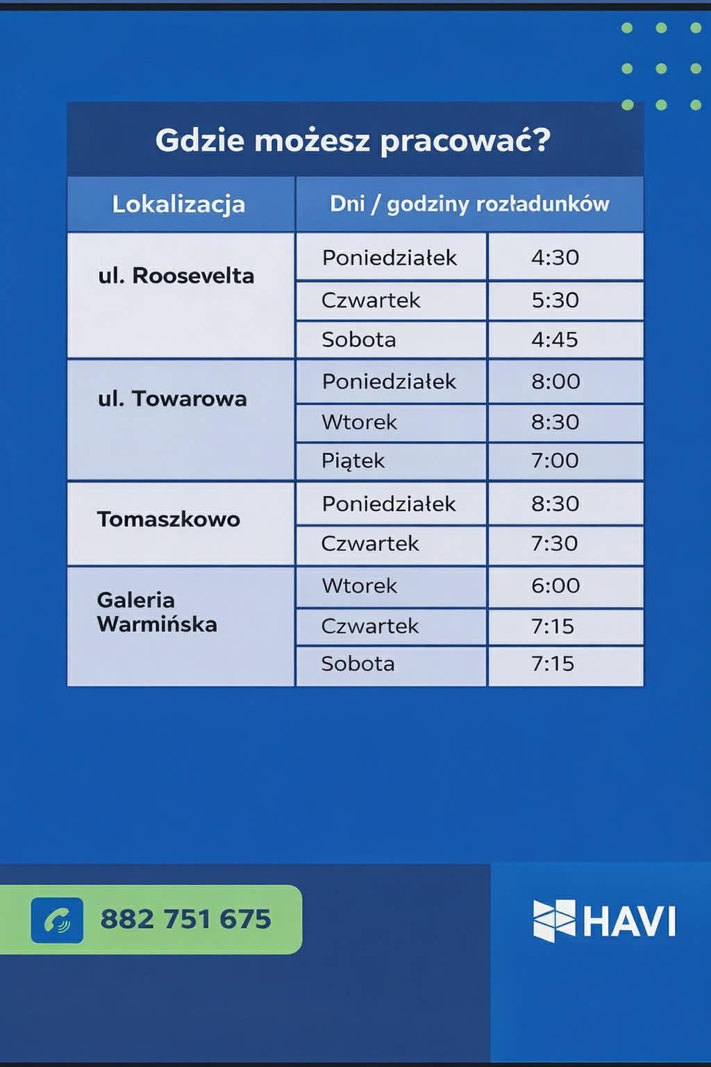 Praca dostępna jest w kilku lokalizacjach na terenie Olsztyna oraz w okolicy. Rozładunki odbywają się w ustalone dni i o konkretnych godzinach porannych.
