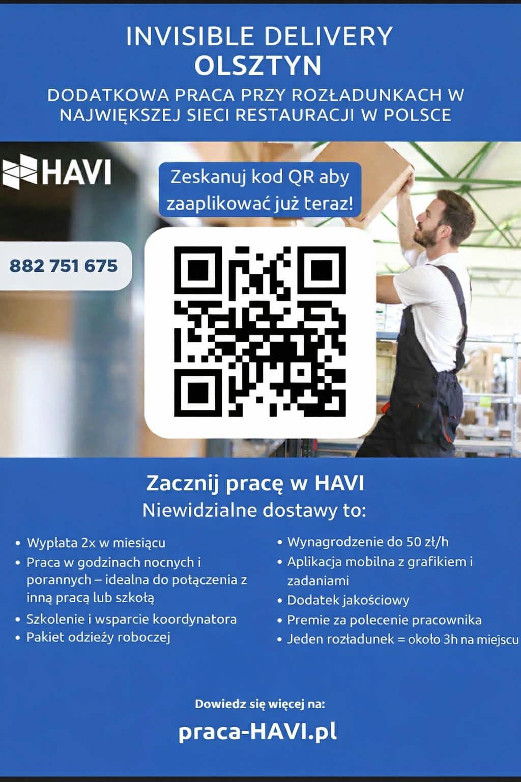 Dodatkowa praca przy rozładunkach w największej sieci restauracji w Polsce jest dostępna w Olsztynie. Firma HAVI prowadzi rekrutację do projektu Invisible Delivery, oferując elastyczne godziny, pracę nocną i poranną oraz możliwość łączenia zajęcia z inną pracą lub szkołą. Ogłoszenie ma charakter sponsorowany i dotyczy konkretnych lokalizacji na terenie miasta i okolic.