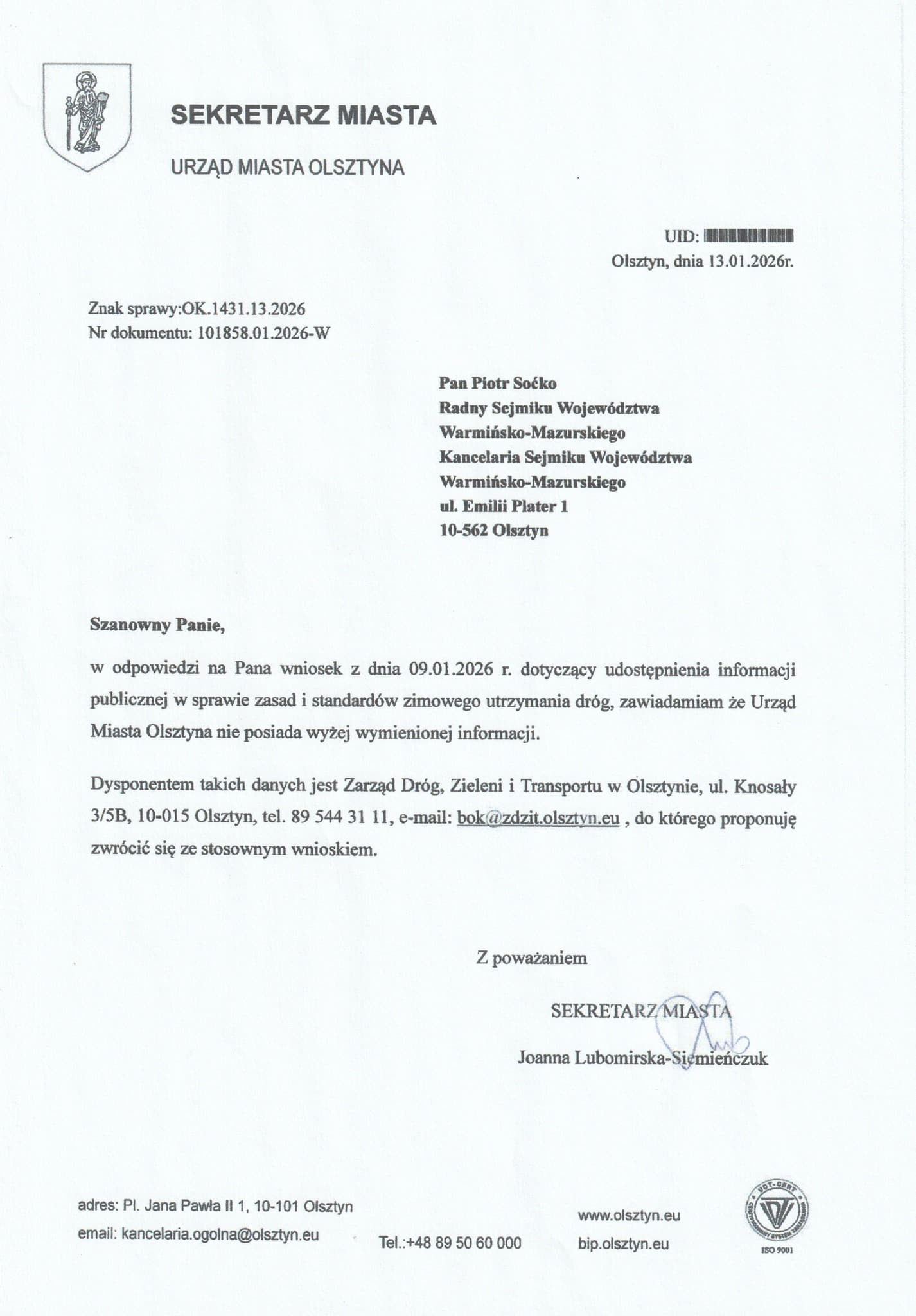Kluczowym dokumentem w sprawie jest odpowiedź z 13 stycznia 2026 roku, podpisana przez sekretarz miasta. Z jej treści wynika, że urząd nie przekazał żadnych merytorycznych danych dotyczących zimowego utrzymania dróg.