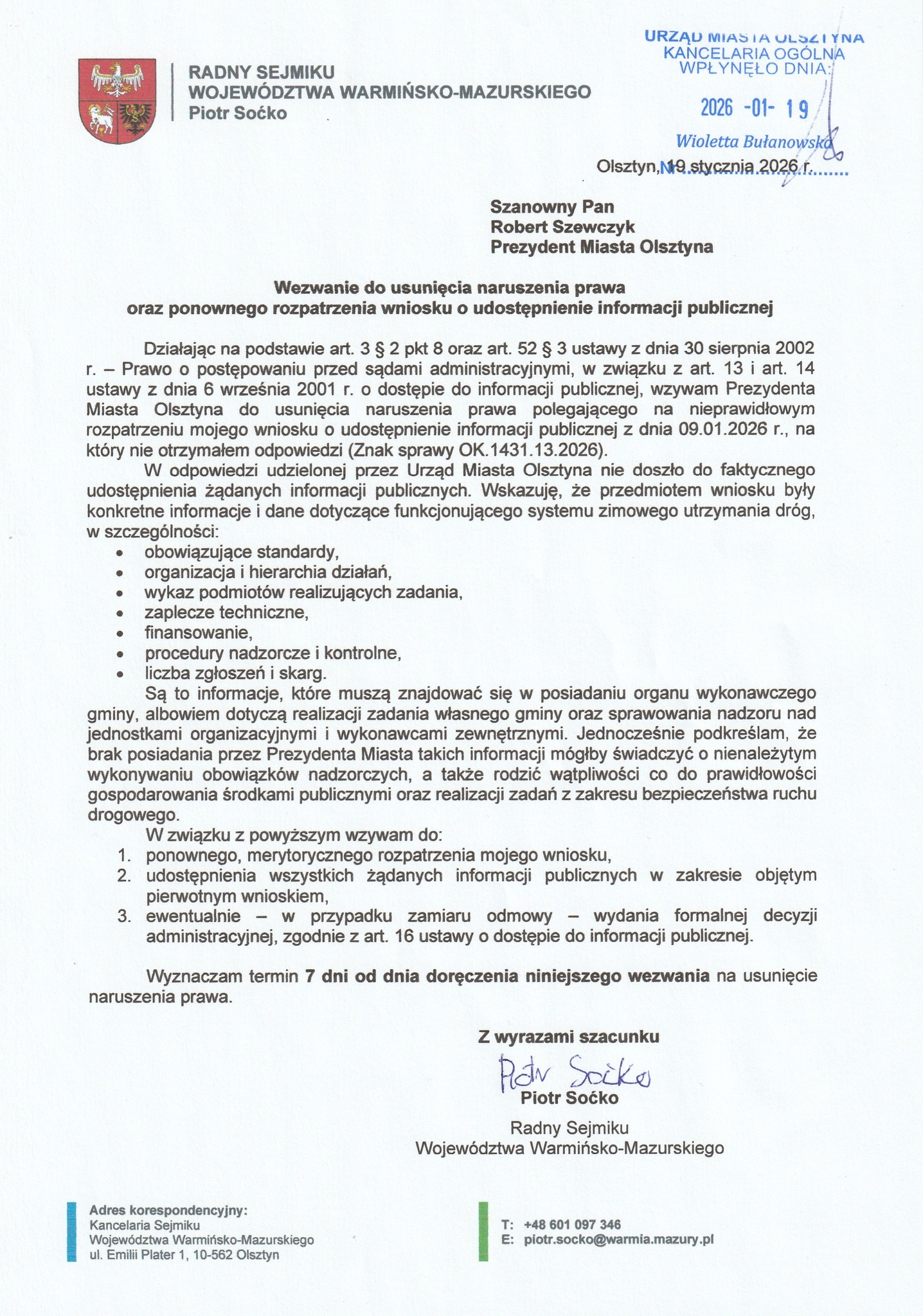 W odpowiedzi na pismo ratusza radny skierował kolejne – formalne wezwanie do zaprzestania naruszania prawa oraz do ponownego, rzetelnego rozpatrzenia wniosku o informację publiczną. W dokumencie wskazuje, że urząd nie udostępnił informacji w żadnym zakresie, a jeśli uznaje, że nie może ich przekazać, powinien wydać decyzję administracyjną, a nie jedynie pismo informacyjne.