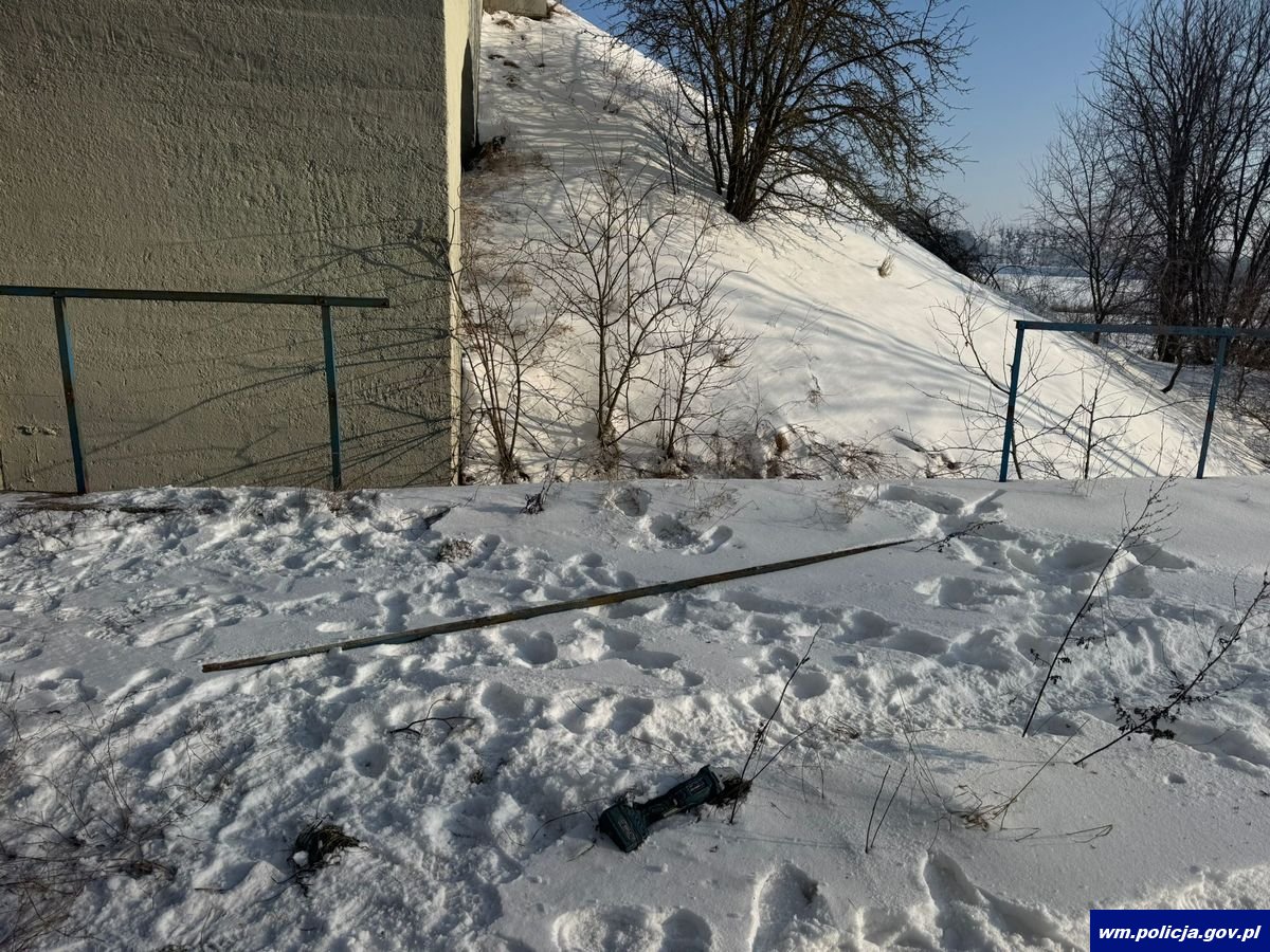 Podjęli interwencję i rozpoczęli kontrolę terenu. W niewielkiej odległości od miejsca, w którym przebywał mężczyzna, zauważyli uszkodzoną barierkę ochronną oraz pocięte metalowe elementy leżące na ziemi. W śniegu znajdowała się również szlifierka, która mogła służyć do cięcia metalu. Tuż obok nasypu kolejowego zaparkowany był samochód osobowy marki Volkswagen.