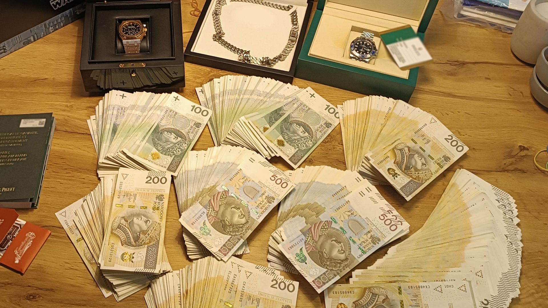 W trakcie akcji służby zabezpieczyły również mienie należące do zatrzymanych. Były to środki pieniężne w różnych walutach, których łączna wartość – po przeliczeniu na złote polskie – wynosi blisko 1 milion złotych. Zabezpieczono także pięć zegarków o wartości przekraczającej 600 tysięcy złotych, biżuterię o szacunkowej wartości około 120 tysięcy złotych oraz sześć sztabek złota o łącznej masie przekraczającej 12 gramów.