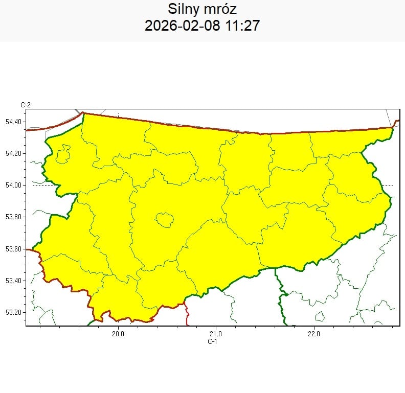 IMGW przekazał również komunikat ostrzegawczy w systemach SMS oraz Rządowego Centrum Bezpieczeństwa. W komunikacie wskazano, że ostrzeżenie pierwszego stopnia przed silnym mrozem dotyczy wszystkich powiatów województwa warmińsko-mazurskiego i obowiązuje w podanym przedziale czasowym.