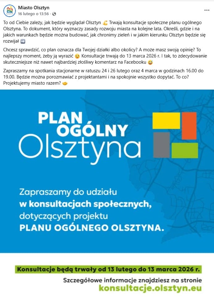 Jednocześnie w debacie publicznej pojawia się wrażenie, że wiele osób dowiedziało się o planie dopiero wtedy, gdy wybuchły spory o konkretne lokalizacje. To wskazuje na możliwą lukę komunikacyjną: komunikacja techniczna dociera do ludzi zainteresowanych, ale nie buduje masowej świadomości skutków. Prezydent nie przeprowadza żadnej kampanii informacyjnej. Wygląda jaby miastu nie zależało na poinformowaniu mieszkańców. Zamieściło na swoim profilu jeden post.
