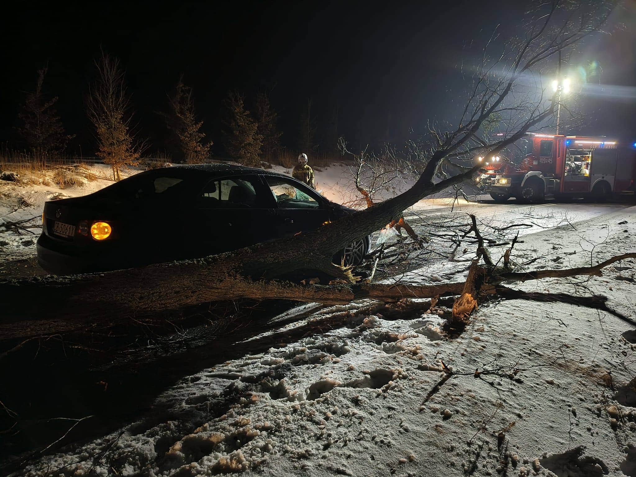 Niebezpieczne zdarzenie na jednej z warmińsko-mazurskich dróg wojewódzkich. Na jadący samochód spadł konar drzewa. W pojeździe podróżowała rodzina z dzieckiem, a trasa została czasowo zablokowana. Na miejscu interweniowały służby ratunkowe.