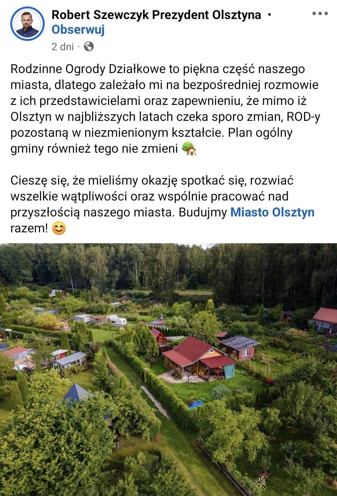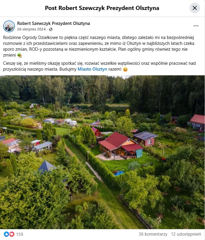 W sierpniu 2024 roku Prezydent Olsztyna Robert Szewczyk spotkał się z przedstawicielami Rodzinnych Ogrodów Działkowych. W publicznym wpisie zapewnił, że ROD-y pozostaną w niezmienionym kształcie, a plan ogólny gminy tego nie zmieni. Dla wielu działkowców były to słowa jednoznaczne.