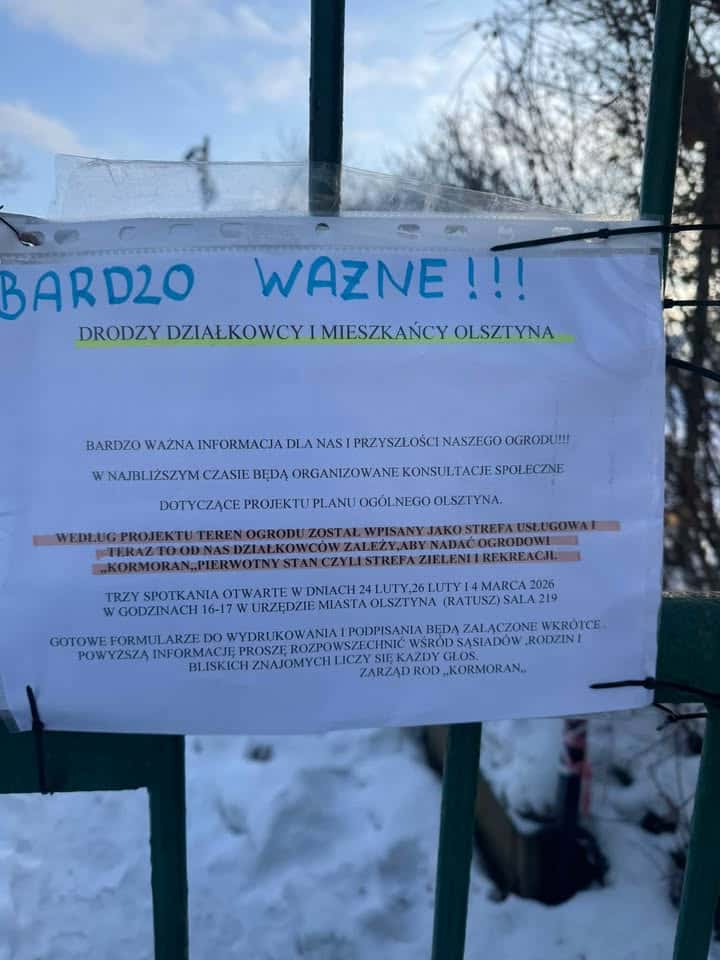 Najbardziej jednoznaczny komunikat pochodzi z ROD „Kormoran”. W wywieszonym ogłoszeniu zarząd ogrodu informuje, że według projektu planu ogólnego teren ogrodu został oznaczony jako strefa usługowa. Jednocześnie apeluje do działkowców i mieszkańców o udział w konsultacjach społecznych oraz składanie wniosków o przywrócenie pierwotnego przeznaczenia, czyli strefy zieleni i rekreacji.