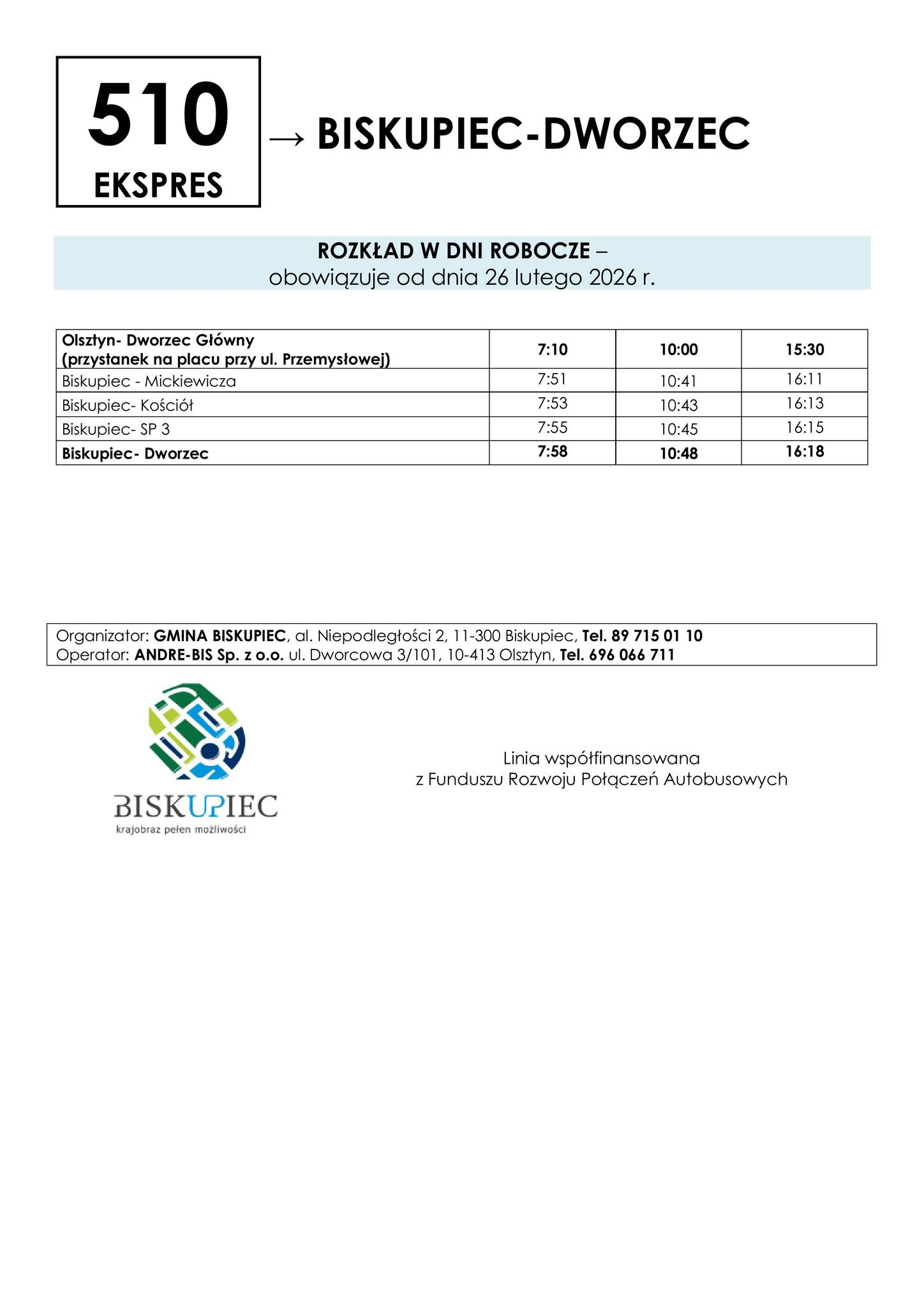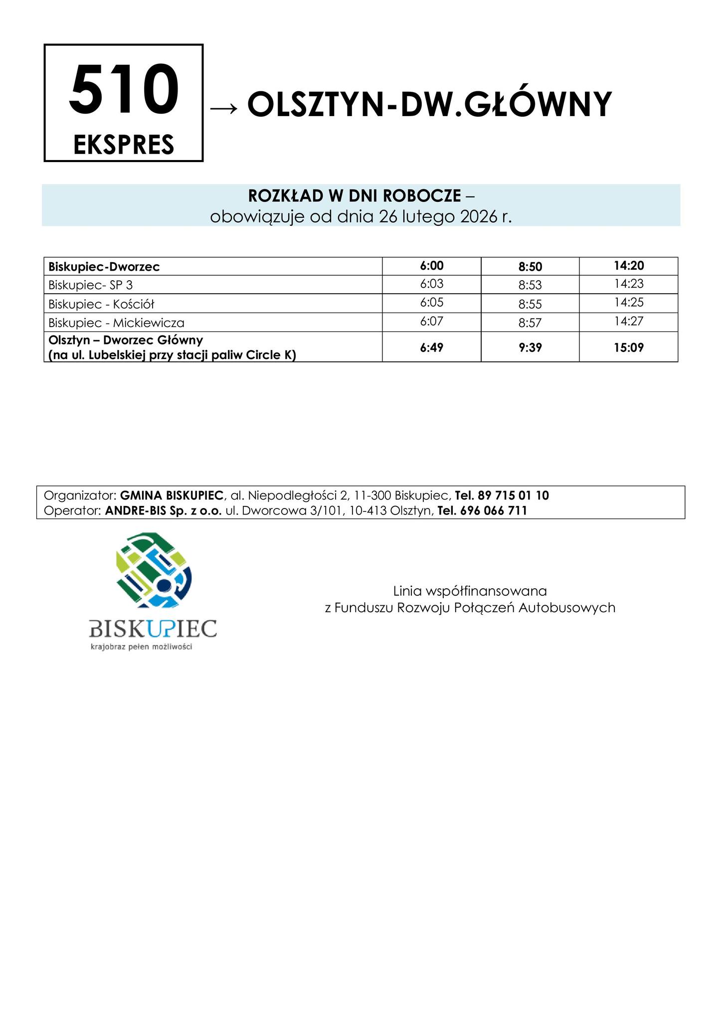 Od 26 lutego 2026 roku mieszkańcy gminy Biskupiec mogą korzystać z nowego, bezpośredniego połączenia autobusowego z Olsztynem. Linia 510 ekspres została uruchomiona z myślą o osobach dojeżdżających do pracy, szkół oraz instytucji w stolicy regionu.