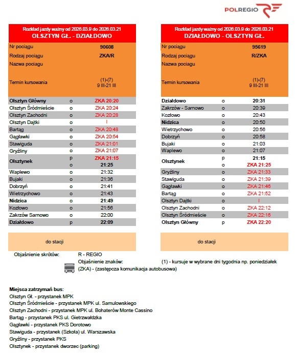 W kierunku przeciwnym skład z Działdowa wyjedzie o 20:31, a autobus zastępczy z Olsztynka do Olsztyna przyjedzie około 22:20.