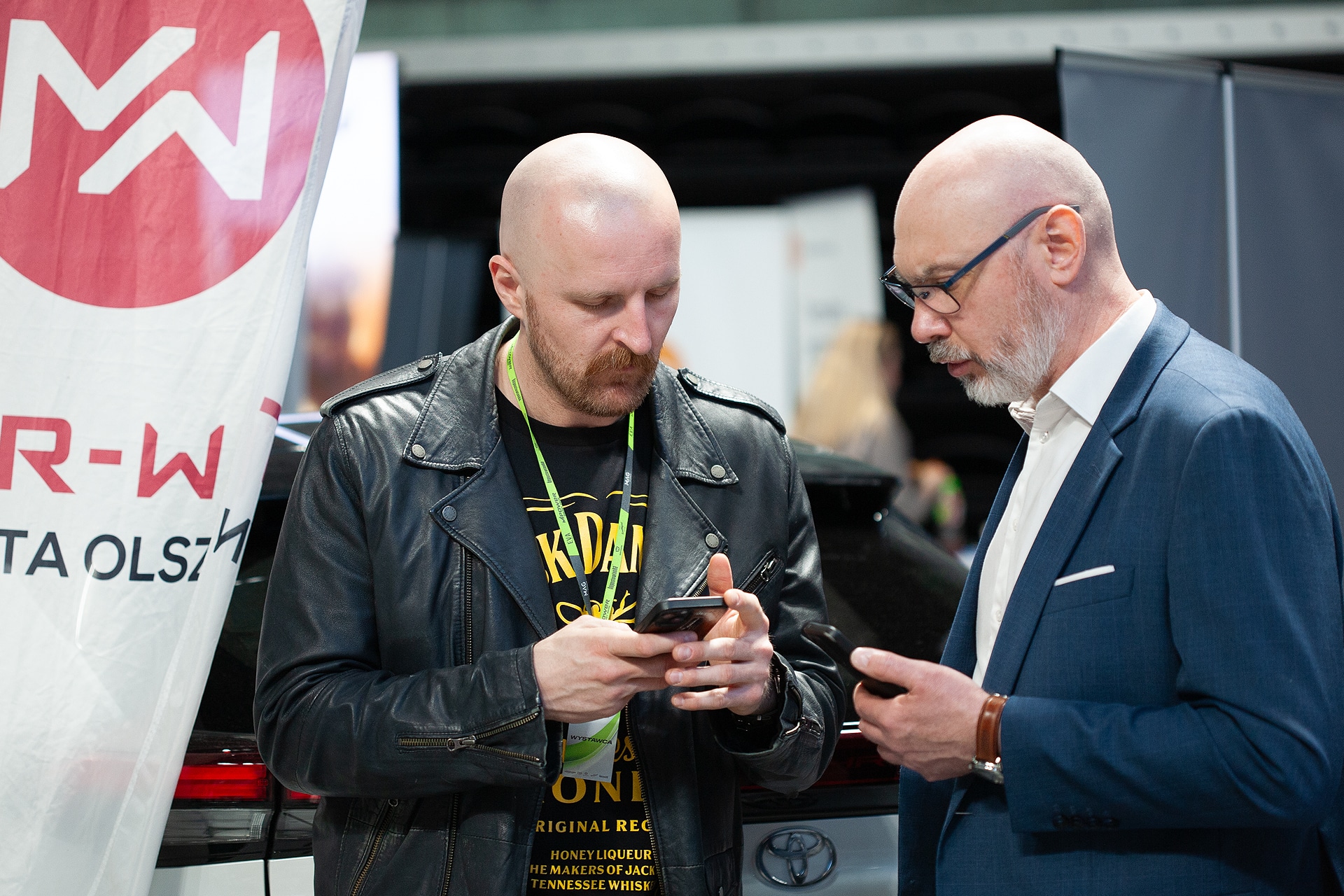 Dwóch mężczyzn rozmawia na scenie podczas targów branżowych w Olsztynie, za nimi logo wydarzenia.