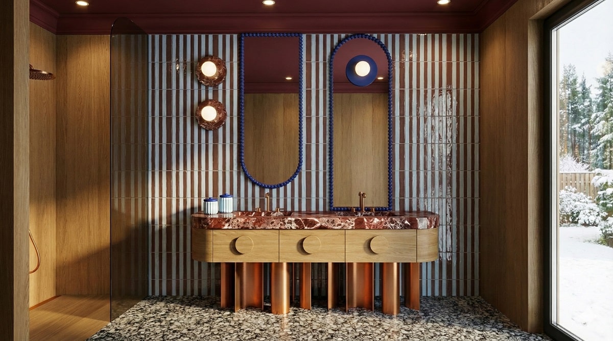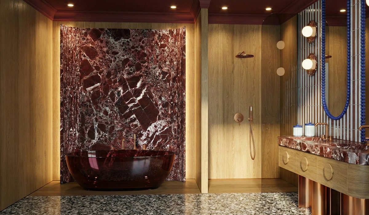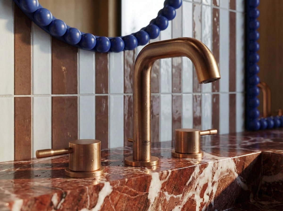 Projektantka postawiła na eklektyczną kompozycję, łączącą marmur Rosso Levanto, ciepłe dębowe drewno oraz wyraziste lastryko. Całość uzupełniają trójwymiarowe kafelki oraz lustra w intensywnych kobaltowych ramach. W projekcie ważną rolę odgrywa także armatura w wykończeniu GROHE Brushed Warm Sunset, która stanowi dekoracyjny akcent wnętrza.