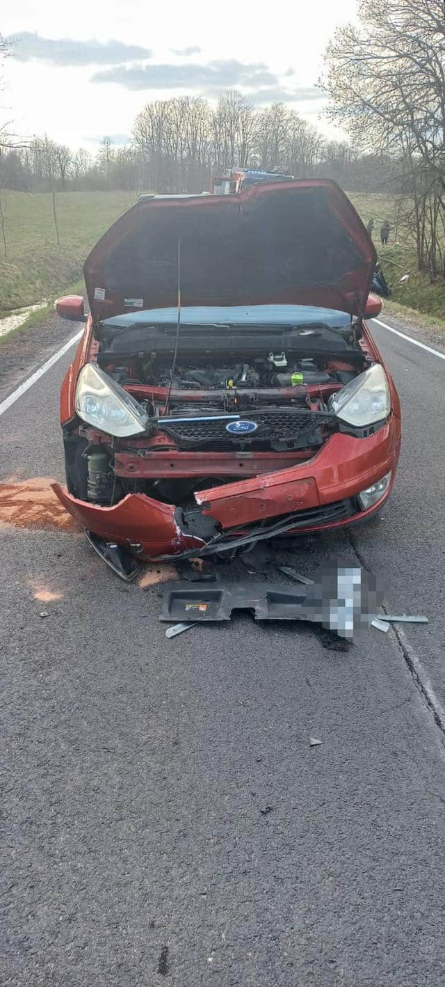 Groźne zdarzenie na drodze krajowej nr 16 między Mrągowem a Mikołajkami. Po uderzeniu samochodu w motocykl jednoślad został wbity w przód auta.
