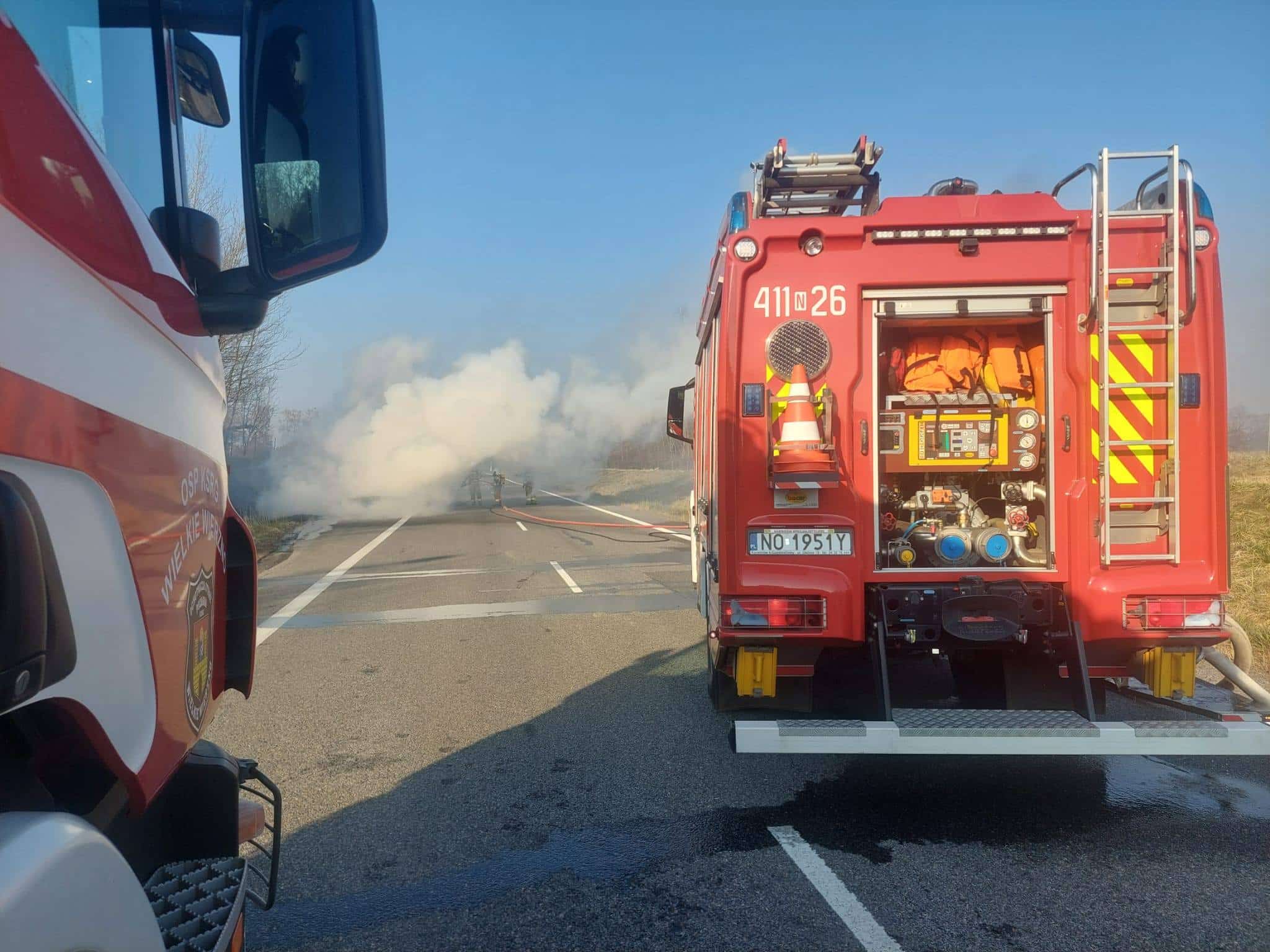 Policjanci kierowali ruchem i dbali o to, aby nie doszło do kolejnych niebezpiecznych sytuacji. Na miejsce szybko dotarła także straż pożarna, która rozpoczęła pilną akcję gaśniczą.