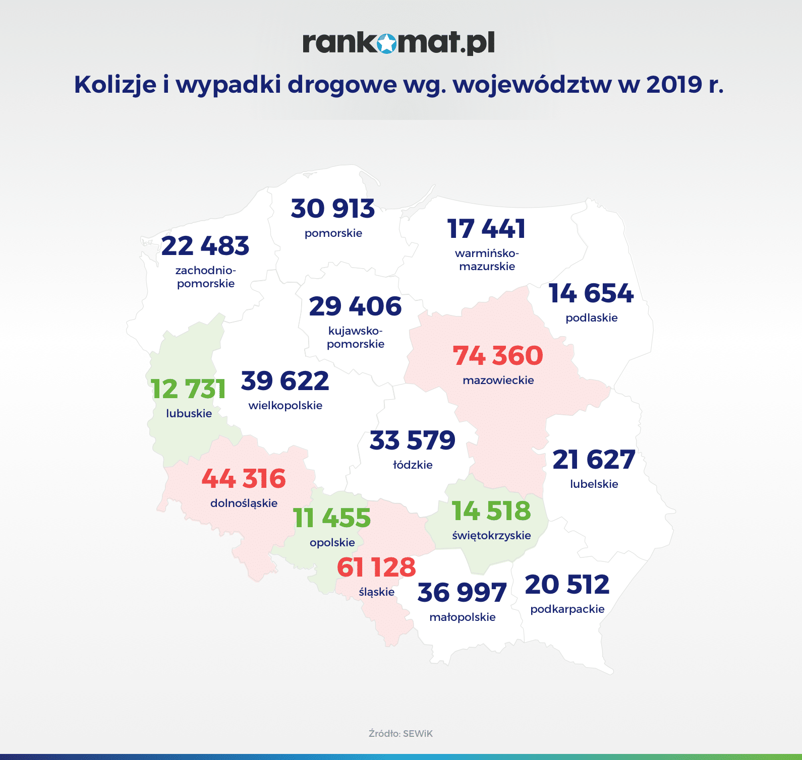W niechlubnej czołówce najbardziej kolizyjnych regionów Polski znalazły się kolejno województwa: mazowieckie, śląskie i dolnośląskie. W województwie warmińsko-mazurskim doszło do 17 441 zdarzeń drogowych. Natomiast najlepiej na tle całej Polski wypada województwo opolskie, w którym doszło do 11 455 zdarzeń drogowych, a także lubuskie (12 731 zdarzeń drogowych) oraz świętokrzyskie (14 518 zdarzeń drogowych). W województwie mazowieckim, gdzie najczęściej dochodziło do kolizji i wypadków drogowych, średnio co godzinę notowano 8 takich zdarzeń. Najczęstszą przyczyną kolizji i wypadków w całej Polsce była nieostrożność kierowców – nieudzielenie pierwszeństwa przejazdu (17% wszystkich zdarzeń), niezachowanie bezpiecznej odległości pomiędzy pojazdami (16%) oraz niedostosowanie prędkości do warunków ruchu (13%).