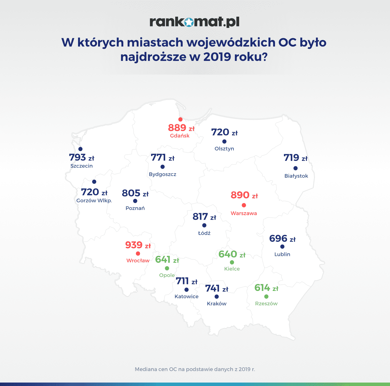 Statystyki wypadkowe z danego miasta mają wpływ na wysokość obowiązkowej polisy komunikacyjnej. Ile w takim razie w ubiegłym roku płacili kierowcy z Olsztyna za ubezpieczenie OC? Okazuje się, że 723 zł. Jest to aż o 77 zł więcej w stosunku do średniej w województwie warmińsko-mazurskim. Patrząc na średnią krajową, kierowcy z Olsztyna płacili o 34 zł więcej, więc jest to relatywnie wysoka stawka. Natomiast i tak na tle całej Polski najgorzej wypada Wrocław, gdzie przeciętna cena za OC wyniosła aż 939 zł. Z kolei najtaniej było w Mielcu, gdzie kierowcy za obowiązkową polisę komunikacyjną płacili średnio 515 zł.