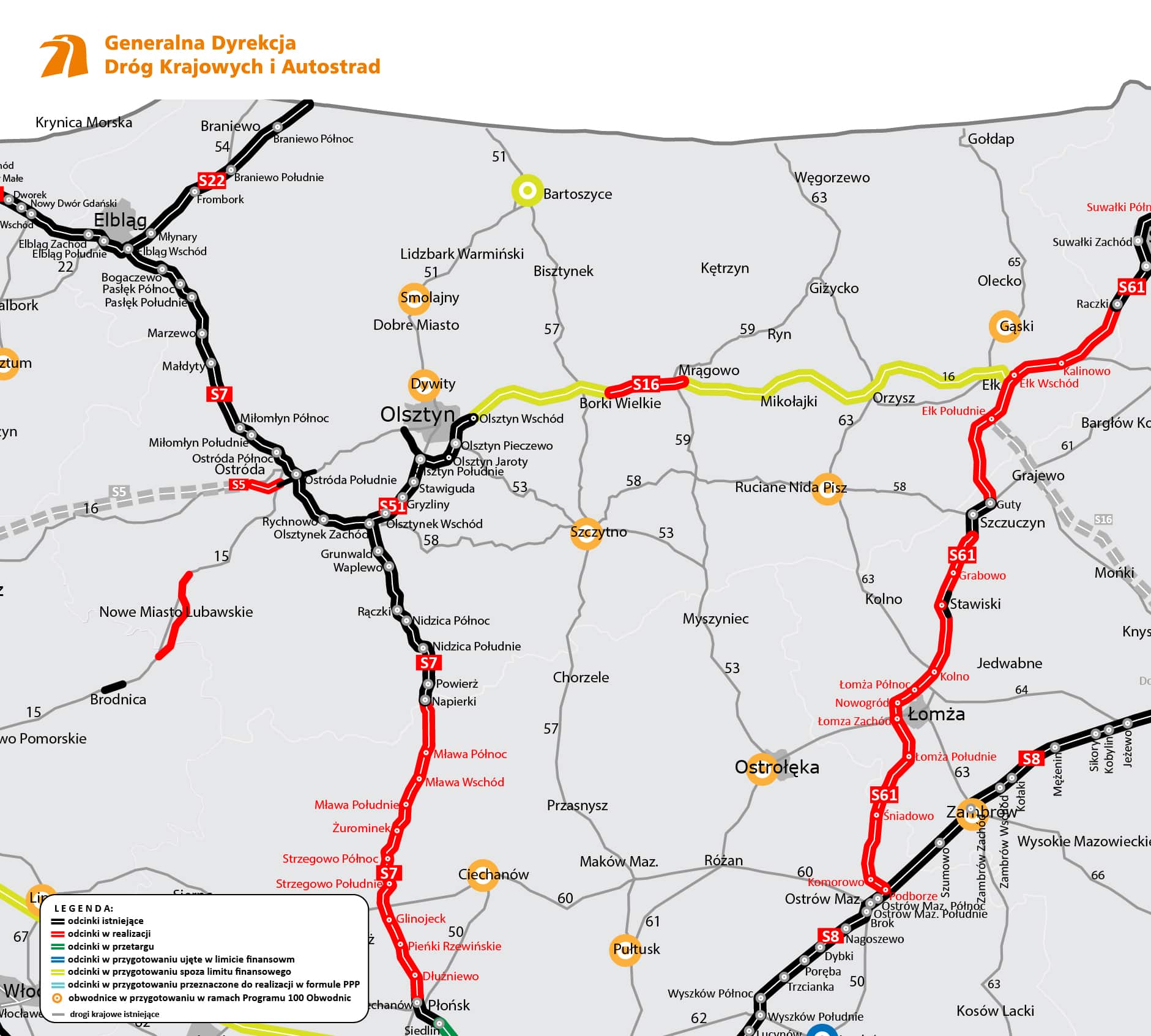 Głębocki dodał, że obecnie w budowie jest 155 km dróg. Trwają prace w terenie na ponad 70-kilometrowym odcinku S7 od granicy województwa warmińsko-mazurskiego i mazowieckiego do obwodnicy Płońska. Toczą się również prace na trzech odcinkach drogi ekspresowej S61 Szczuczyn – Raczki (66,4 km) w ciągu Via Baltica. W ciągu drogi krajowej nr 15 trwa budowa obwodnicy Nowego Miasta Lubawskiego o długości 17,7 km.