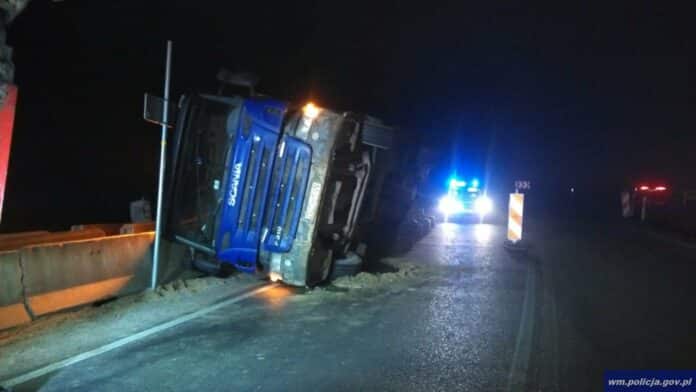 Pod Olsztynem ciężarówka przewróciła się na bok