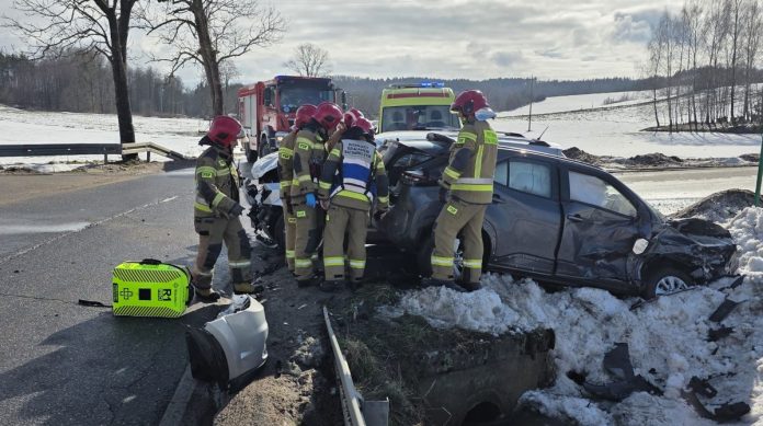 Czołowe zderzenie busa i samochodu osobowego. Trzy osoby trafiły do szpitala