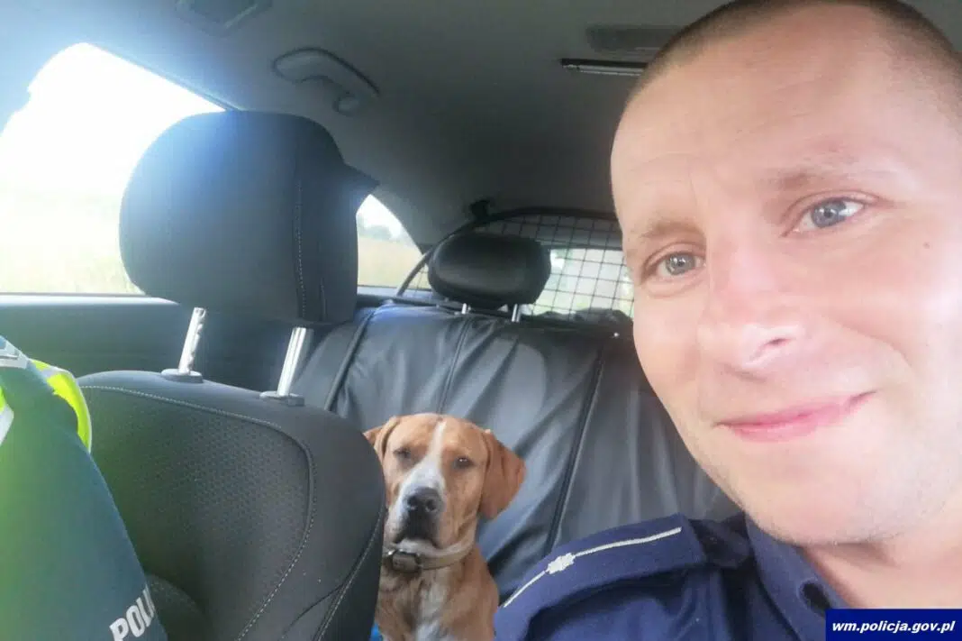 Policjant uratował błąkające się psy przy drodze. O mało nie doszło do tragedii.